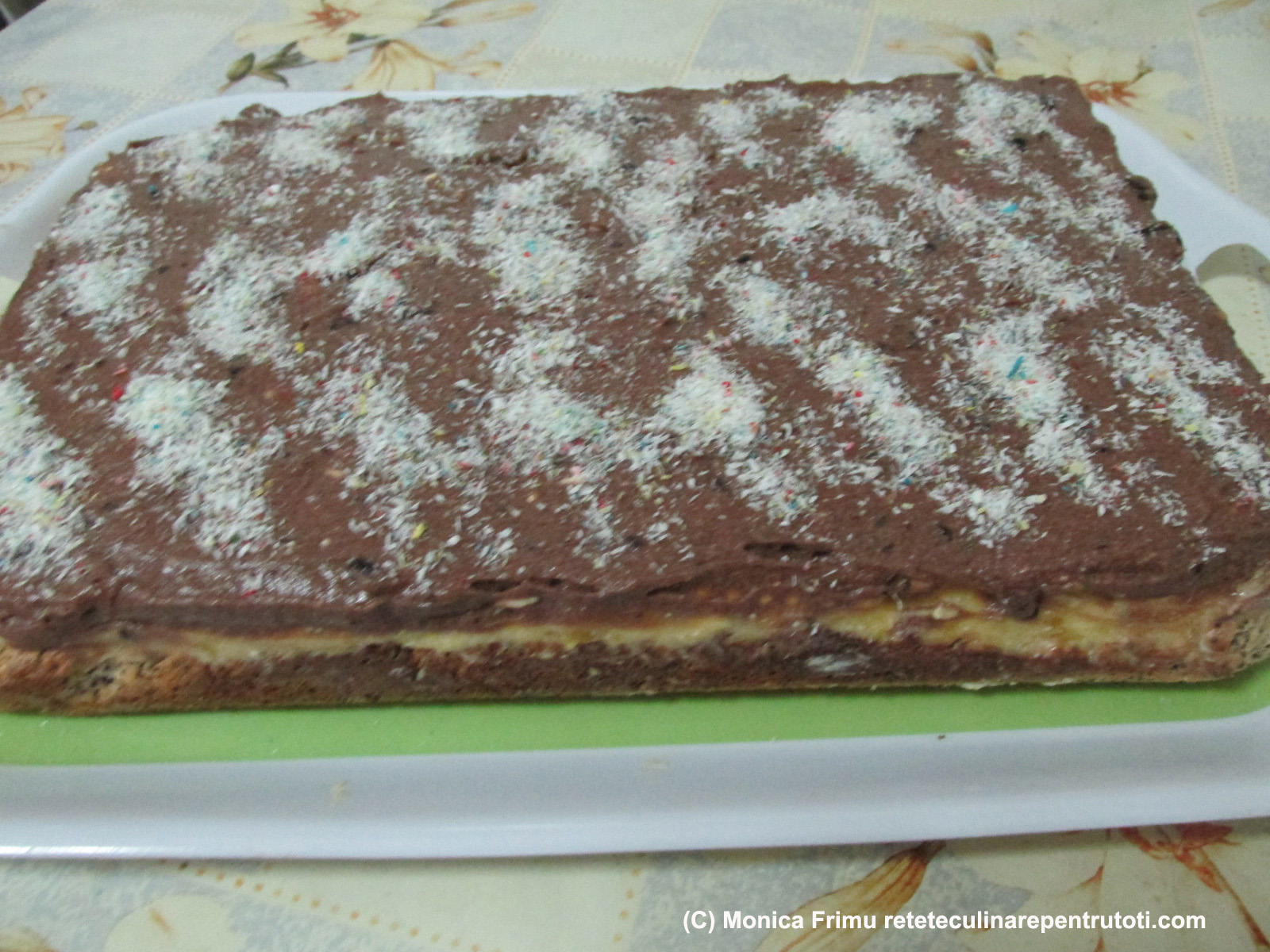 Deasupra întindem crema de ciocolată. Decorăm cu ciocolată și fulgi de cocos colorați.