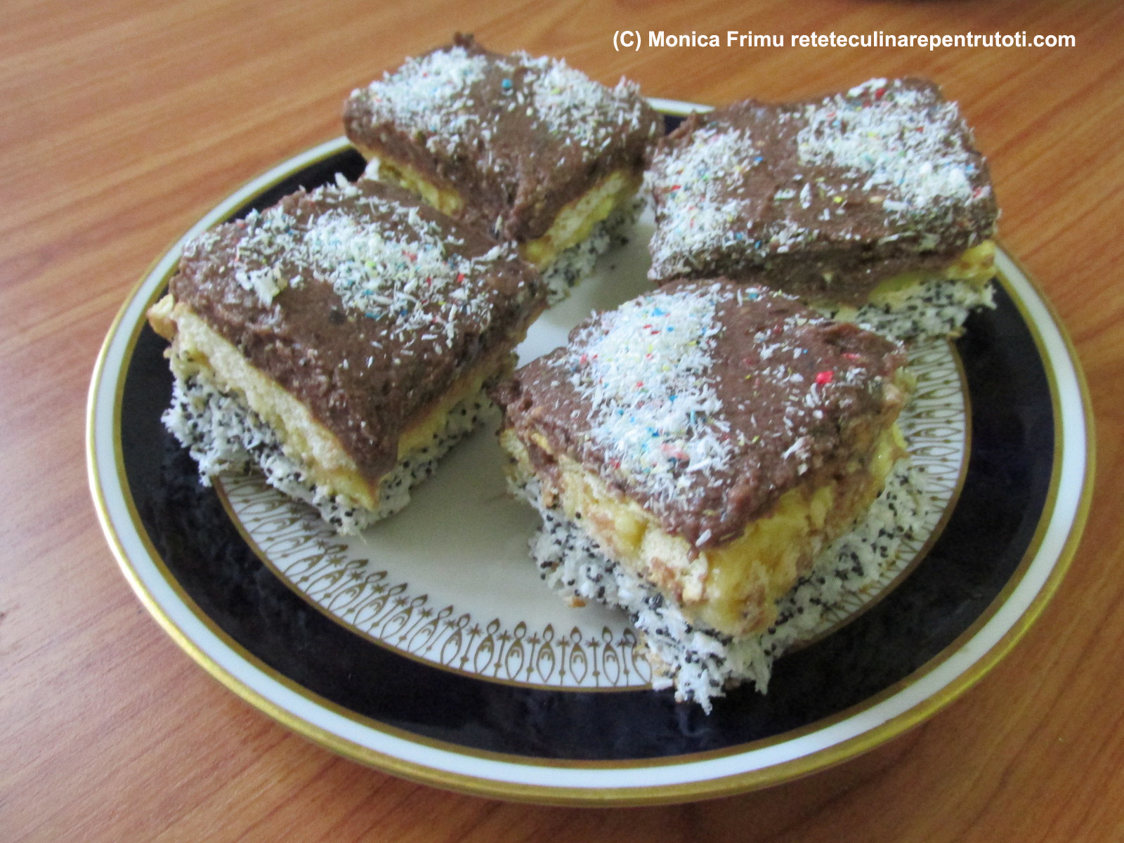 Mixăm albușurile spumă tare cu un praf de sare, adăugăm 200 g zahăr și mixăm până devin cremoase și lucioase. Punem făina, nuca de cocos, macul și amestecăm cu o lingură până omogenizăm. Întindem uniform într-o tavă unsă și tapetată cu hârtie de copt. Punem în cuptorul preîncălzit la foc mare (220) 10 minute, apoi la foc mai mic (160) aproximativ 15 minute, până se rumenește și se desprinde de pe marginile tăvii. Răcim, îndepărtăm hârtia și așezăm pe un platou/tavă.