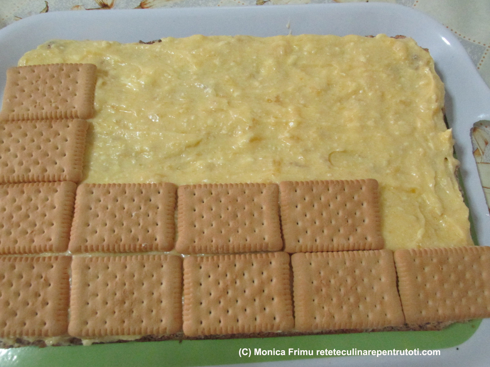 Întindem crema de vanilie pe blat și acoperim cu biscuiți.