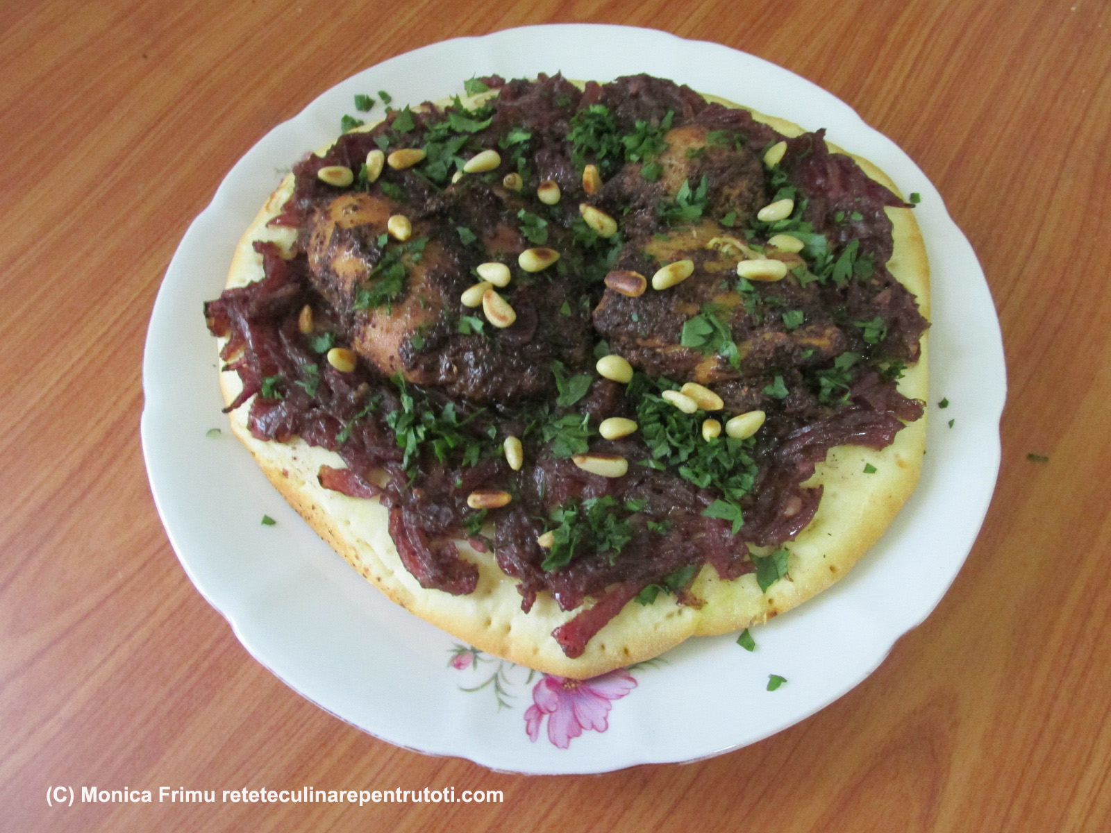 Într-o tavă, tapetată cu hârtie de copt, așezăm foile de pizza, deasupra întindem uniform ceapa și, pe fiecare, așezăm 2 pulpe. Punem în cuptorul preîncălzit la foc mai mare (200) aproximativ 40 minute. Prăjim sec semințele de in, tăiem mărunt pătrunjelul. Servim câte o foaie presărată cu pătrunjel și semințe de pin.