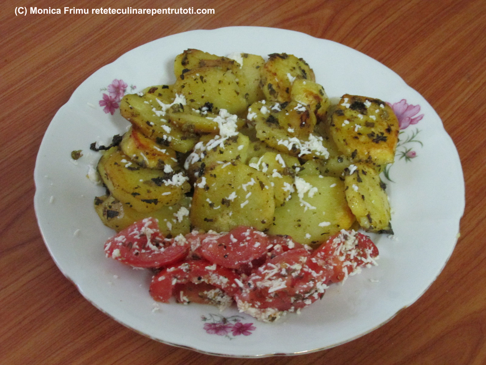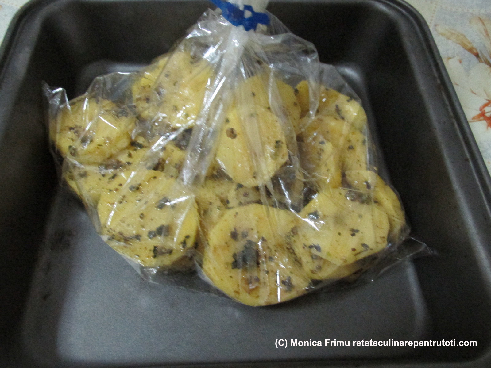 – 500 g cartofi albi, 1 lingură condiment pt. cartofi prăjiți, 1 lingură busuioc uscat, 2 căței de usturoi, 2-3 linguri ulei, 100 g brânză telemea, 1 pungă pt. cuptor