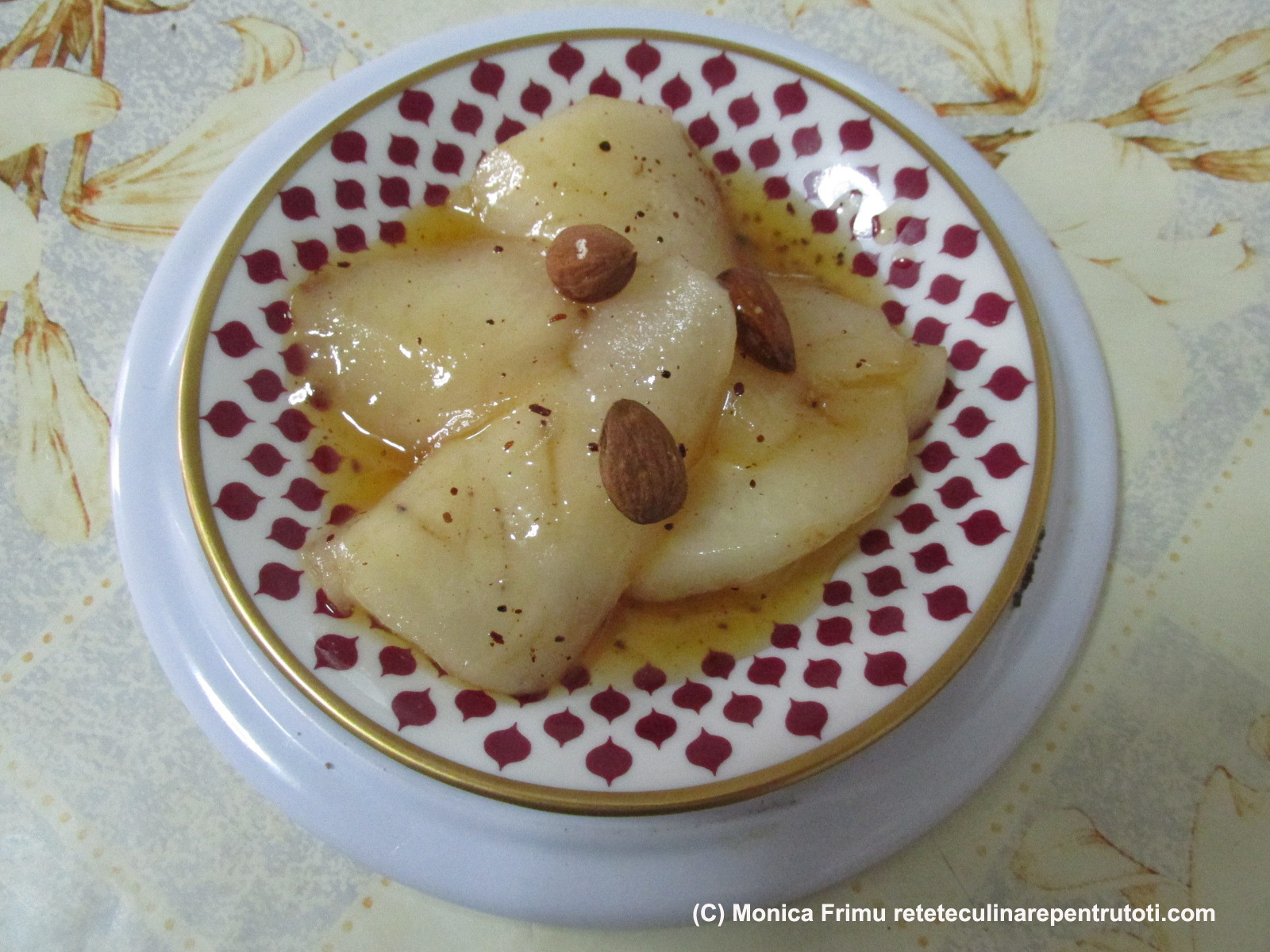 – 1 pară mare (300 g), 50 g unt, 50 g zahăr, 1 linguriță plină scorțișoară, opțional zeamă de lămâie