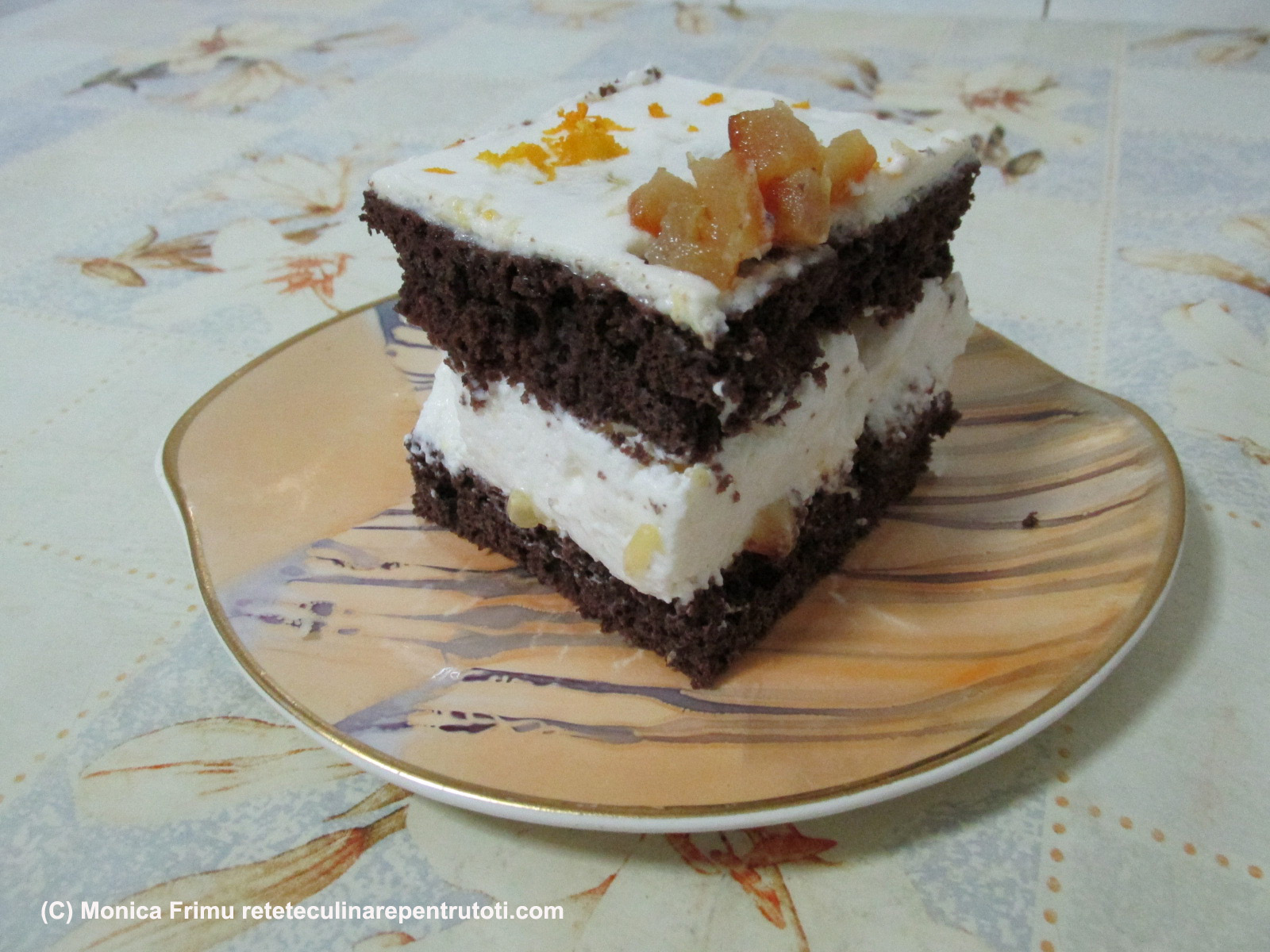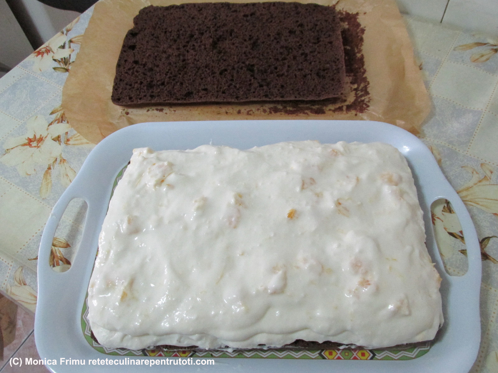 Mixăm albușurile spumă tare cu un praf de sare, adăugăm 7 linguri de zahăr și mixăm până devin cremoase și lucioase. Punem gălbenușurile, amestecăm ușor cu o lingură, apoi turnăm în ploaie făina amestecată cu praful de copt și cacao și omogenizăm. Într-o tavă unsă cu ulei și tapetată cu hârtie de copt întindem uniform compoziția. Punem în cuptorul preîncălzit, la foc mediu, aprox. 25 min. Răcim și tăiem ½ pe orizontală. Curățăm portocala de coajă și partea albă, apoi o tăiem cubulețe. Mixăm frișca tare. Amestecăm iaurtul cu 4 linguri de zahăr până se topește. Înmuiem gelatina în 2 linguri de apă 10 min.; o dizolvăm pe foc mic, amestecând continuu, având grijă să nu fiarbă. Răcorim și amestecăm cu iaurtul, bucățelele de portocală, apoi cu frișca și omogenizăm.