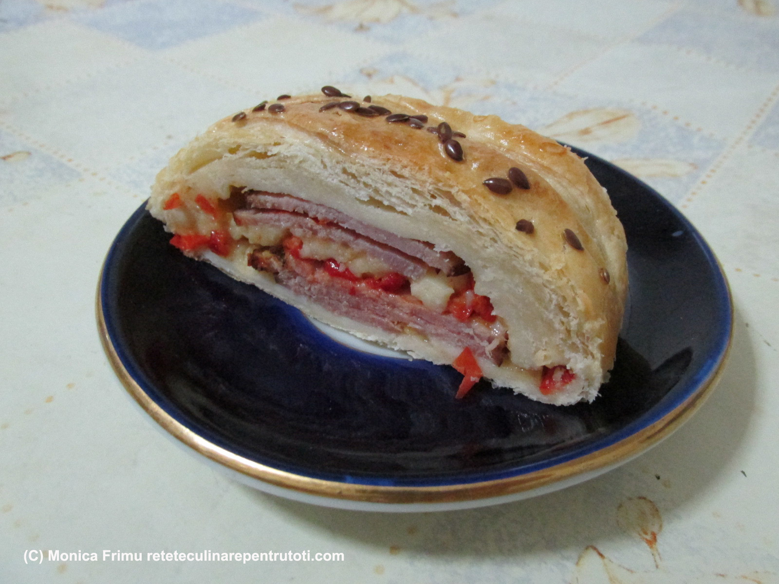 – 1 foaie aluat foietaj din comerț (400 g), 200 g pastramă de porc feliată, 50 g cașcaval, 1 ardei capia roșu, 1 ou, semințe de in