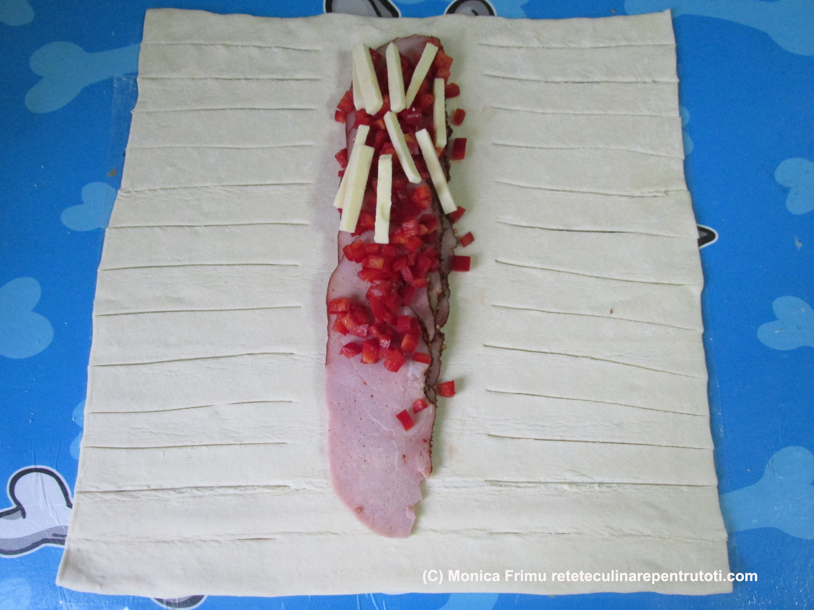 Decongelăm aluatul. Curățăm și tăiem ardeiul cubulețe, cașcavalul bețișoare. Întindem aluatul, mental împărțim 1/3 în lungime. Mijlocul rămâne intact, marginile se taie fâșii de 2 cm lățime până la partea din mijloc, pe care așezăm ½ din feliile de pastramă, suprapuse în lungime. Deasupra presărăm ardei și cașcaval.