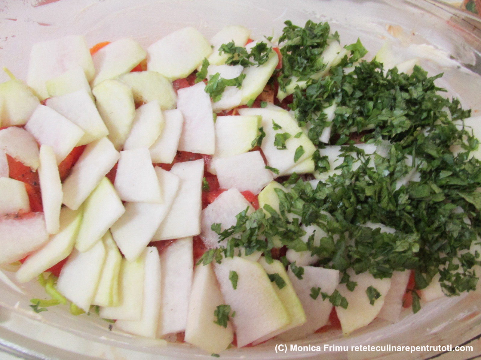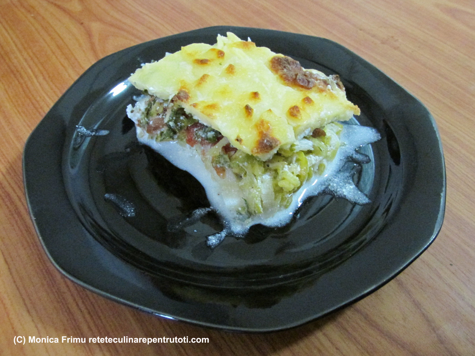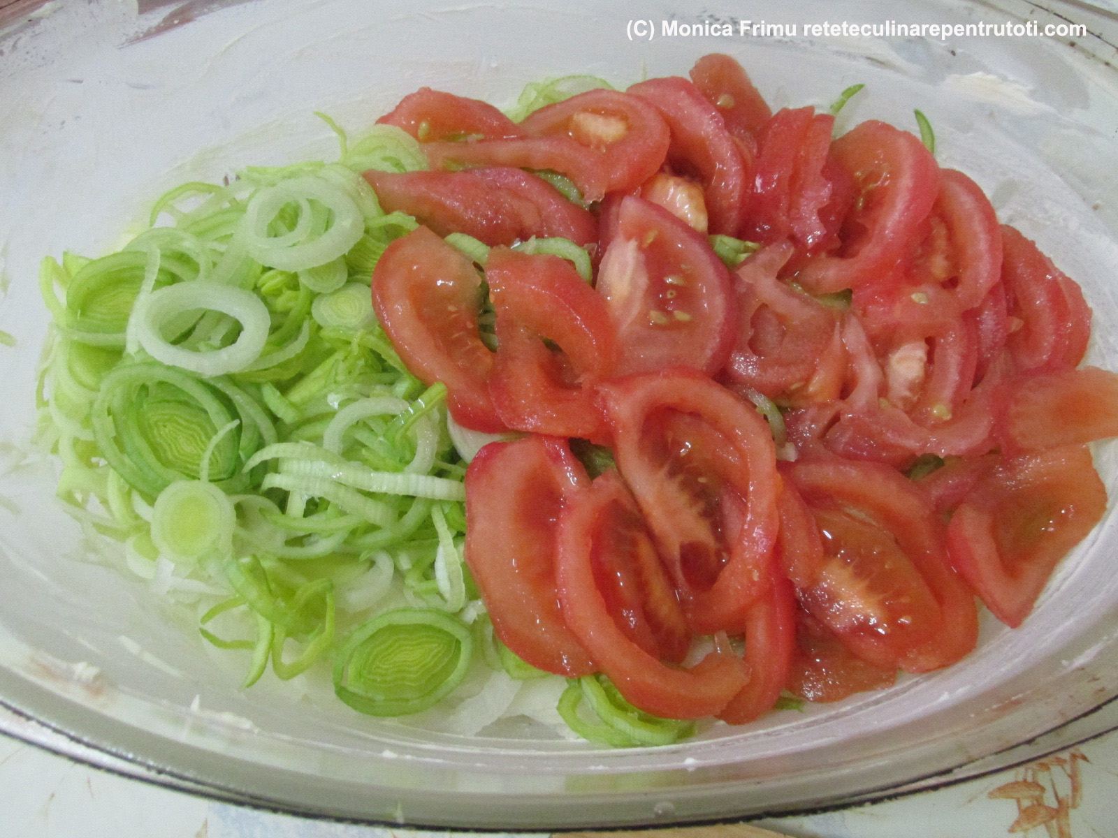 Curățăm prazul și tăiem rondele subțiri. Opărim roșiile, curățăm de coajă și cotor, apoi tăiem feliuțe. Decojim gulia și tăiem feliuțe subțiri. Tocăm mărunt pătrunjelul, scurgem și tăiem cubulețe mozzarella, radem cașcavalul. Într-un vas yena uns cu unt așezăm prazul, peste roșiile.