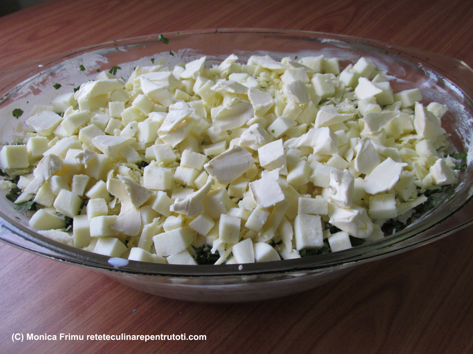 Amestecăm laptele cu smântâna și turnăm amestecul peste legume. Deasupra presărăm cașcavalul, mozzarella și untul tăiat bucățele.