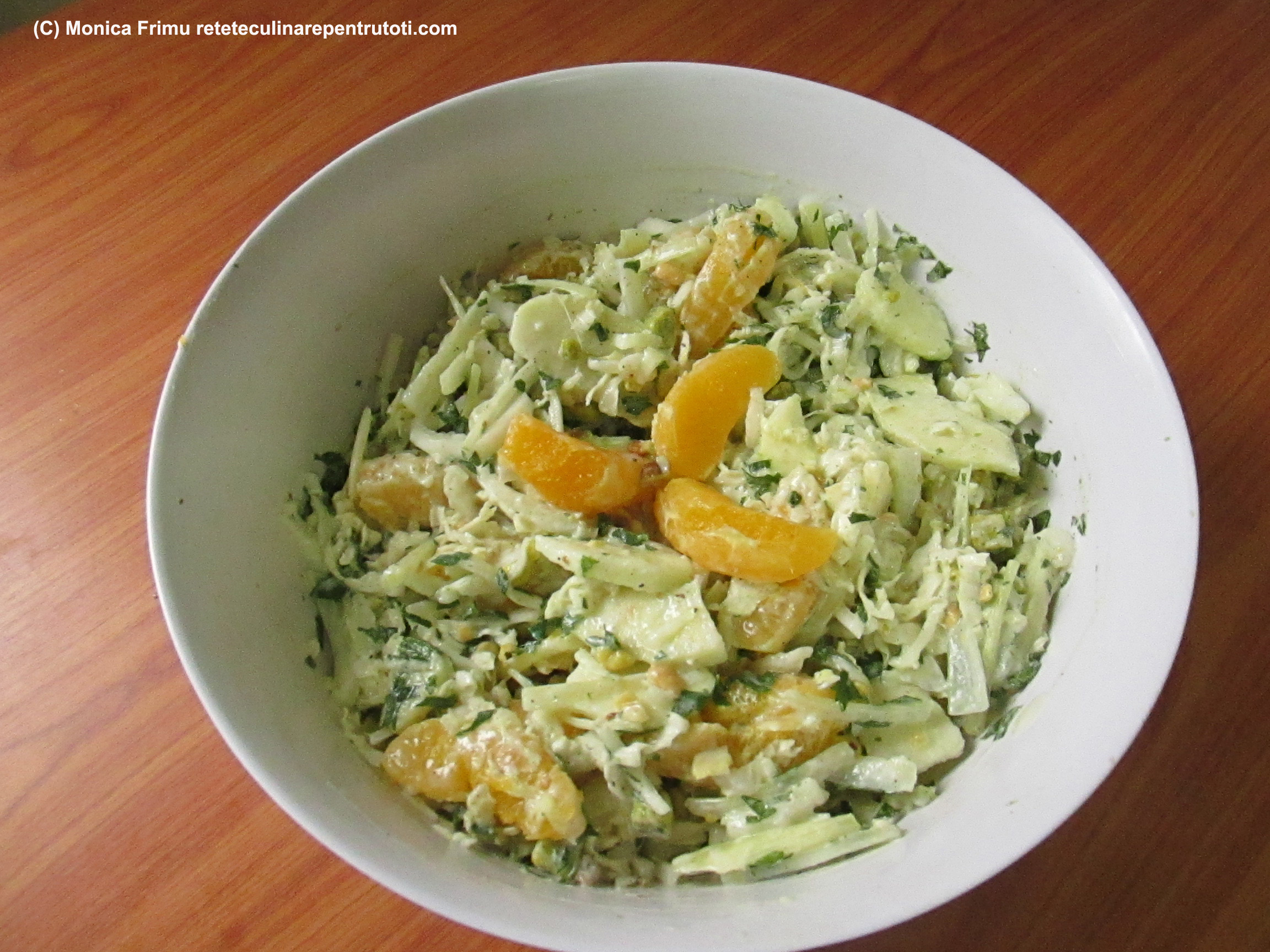 Curățăm și tăiem varza fâșii, apio bastonașe mai lungi, mărul, cu coajă. La măr îndepărtăm cotorul cu semințe, spălăm, tăiem felii tăiat felii şi stropim cu puțină zeamă de lămâie, pentru a nu se oxida. Curățăm portocalele de coajă și pieliţa albă apoi desfacem feliile. Tocăm mărunt pătrunjelul. Le apunem pe toate într-un bol. Separat amestecăm zeama de lămâie cu uleiul, iaurtul, sare şi piper după gust. Turnăm compoziţia în bol, adăugăm crutoanele şi amestecăm până omogenizăm.