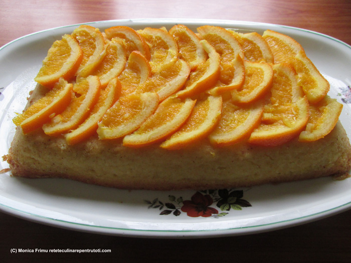 Punem în cuptorul preîncălzit la foc mediu (180) aproximativ 30 minute (testul cu scobitoarea în blatul de deasupra). Tăiem cele 2 portocale feliuțe subțiri și fierbem într-o cană de apă. Când clocotește micșorăm focul la minim și fierbem 10 minute. Strecurăm și punem iar la fiert în 2 căni de apă împreună cu zahărul. Când clocotește micșorăm focul la minim și fierbem 20 minute. Scoatem vasul din cuptor, înțepăm pandișpanul din loc în loc cu o scobitoare și însiropăm cu o parte din siropul de portocale. Răsturnăm budinca pe un platou, înțepăm orezul cu o scobitoare și turnăm restul de sirop. Ornăm cu feliile de portocale. Răcim, porționăm și servim.