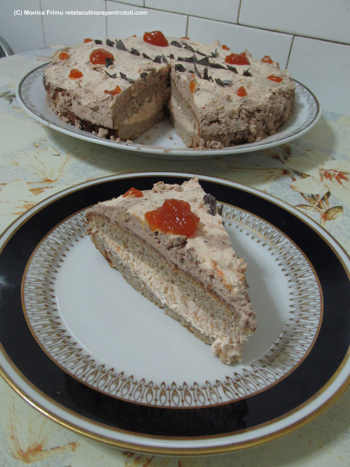 – 200 g făină, 1 linguriță praf de copt, 3 ouă, 200 g unt, 200 g zahăr, 1 lămâie, 1 linguriță scorțișoară măcinată, ½ linguriță cuișoare măcinate, un praf de sare, 400 ml frișcă, 4 linguri gem de caise, 125 g ciocolată cu lapte și alune