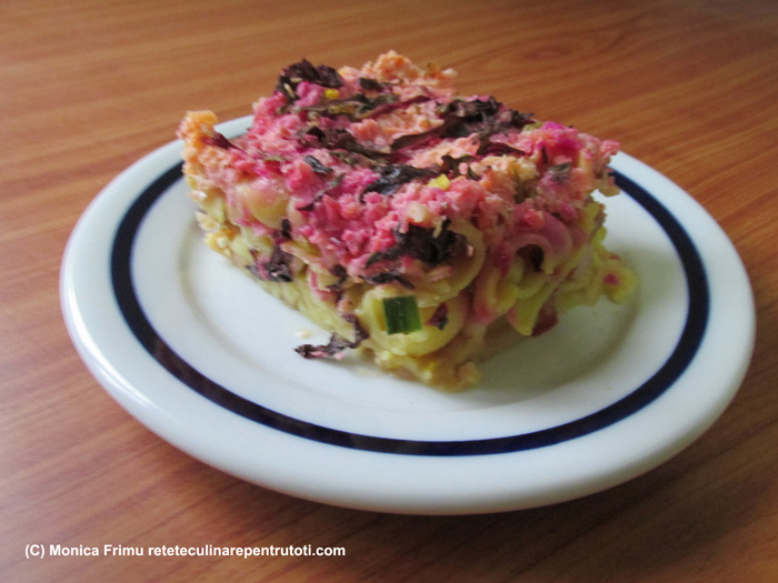În apă clocotită cu puțină sare și șofran fierbem pastele, scurgem și amestecăm cu ulei. Curățăm și măcinăm cu robotul morcovii și păstârnacul; tăiem mărunt mărul și usturoiul, ardeiul și șunca cubulețe; tăiem loboda fâșii. Amestecăm șunca cu ardeii, sare și piper după gust. Facem un amestec din iaurt, sare și tarhon. Ungem un vas Yena cu margarină, tapetăm cu pesmet, punem ½ paste și presărăm amestecul de șuncă cu ardei.