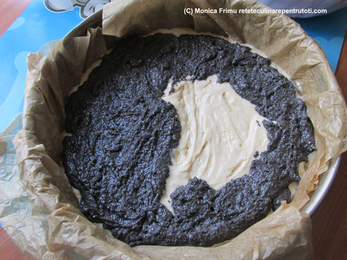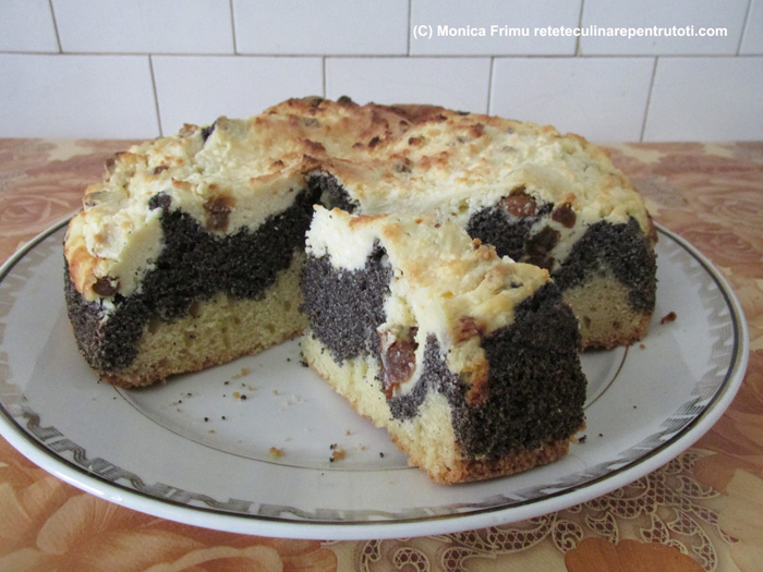 Punem în cuptorul preîncălzit la foc mediu (180) aprox. 30-35 min. (testul cu scobitoarea-să nu rămână pe ea mac sau blat). Scoatem din cuptor, răcorim câteva minute, îndepărtăm hârtia și răcim pe un grătar Servim tăiată felii.