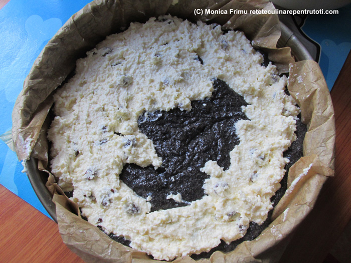 Preparăm umplutura din brânză. Amestecăm bine brânza cu untul topit, adăugăm ouăle bătute cu furculița, zahărul, zahărul vanilat, coaja de lămâie, stafidele, făina amestecată cu praful de copt. Întindem uniform peste umplutura din mac.