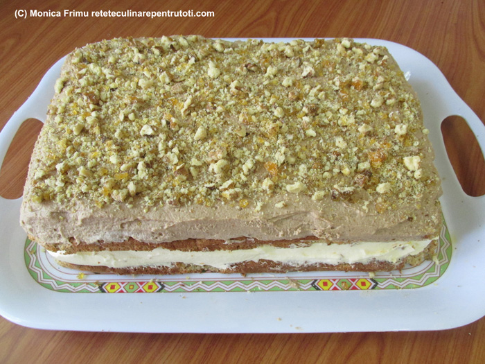 Îndepărtăm hârtia de pe o foaie de blat, o așezăm pe un platou și întindem crema de mascarpone. Acoperim cu a doua foaie de blat, îndepărtăm hârtia, întindem crema de ciocolată și punem în frigider până a doua zi.