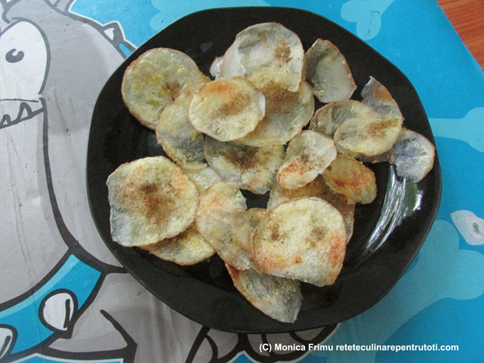 Spălăm un cartof nou mare, tăiem rondele f. subțiri, le așezăm pe o hârtie de copt. Presărăm cu condimente după plac/brânză rasă/verdețuri uscate, putem stropi/nu cu ulei.