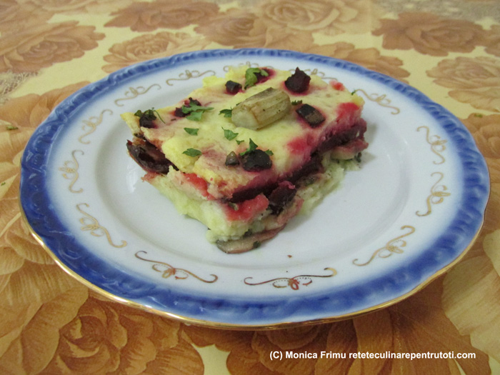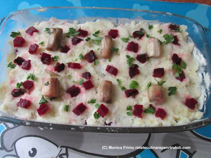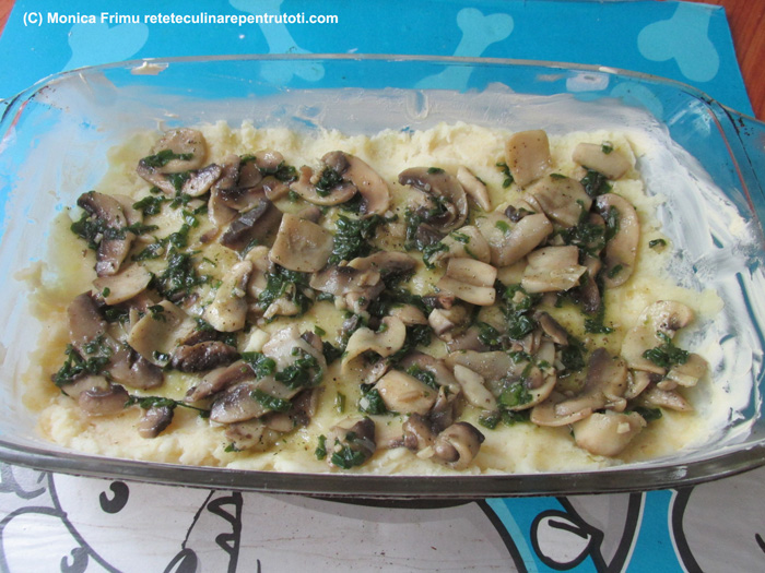 Curățăm și tăiem cartofii cuburi, usturoiul și ceapa mărunt; sfecla rondele. În apă cu sare fierbem cartofii, scurgem, pasăm și amestecăm cu smântâna, obținând un piure gros. Curățăm și tăiem ciupercile felii (păstrăm pt. decor piciorușe) În ulei călim ceapa, usturoiul adăugăm ciupercile, sare, piper și un strop de apă. Fierbem până se înmoaie. Spre sfârșit punem și piciorușele pt. decor și amestecăm până scade zeama., apoi le scoatem de o parte. Într-un vas Yena uns cu margarină întindem ½ cartofi. Deasupra punem ciupercile.