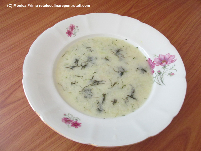 Curățăm și radem dovleceii, sărăm și lăsăm să stea 10 min. Curățăm legumele, radem și le călim în ulei 2 min. Turnăm apa, când fierbe punem dovleceii, dăm 2-3 clocote, stingem focul și răcorim. Separat batem ouăle, amestecăm cu lapte, puțină zeamă din ciorbă și amestecăm în oală. Sărăm, piperăm și acrim cu zeamă de lămâie. Servim presărată cu mărar tocat.