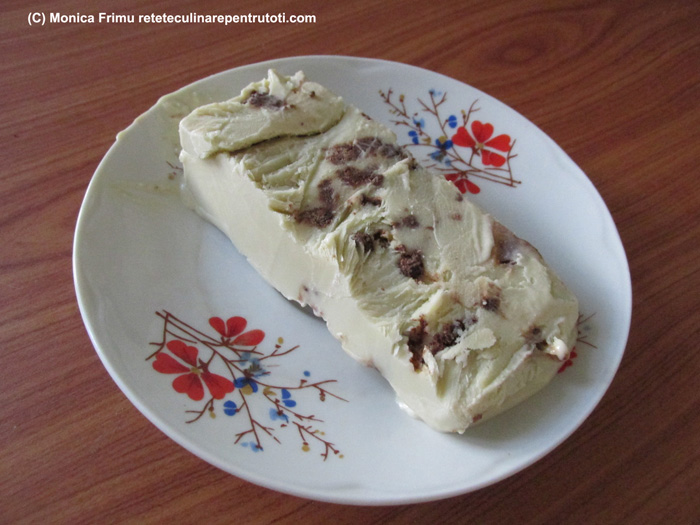 Încălzim pe foc zahărul amestecat cu menta, laptele și 250 ml frişcă. Luăm de pe foc şi ţinem acoperită cu capac 30 minute. Frecăm gălbenușurile. Scoatem menta o presăm şi sucul îl amestecăm în lapte. Punem iar pe foc, încălzim şi turnăm treptat peste gălbenuşuri. Răcim şi încorporăm în 250 ml frişcă bătută tare. Topim ciocolata. În caserolă punem câteva fâşii de ciocolată, apoi compoziție de mentă, peste ciocolată; repetăm operația formând mai multe straturi, acoperim și punem în congelator. Scoatem, lăsăm să stea 10 min. la temperatura camerei, porționăm și servim.