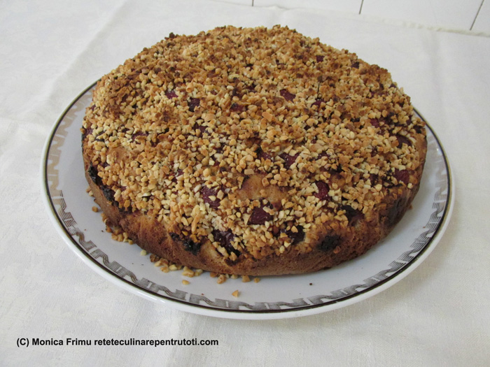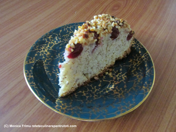 Într-un bol amestecăm ingredientele uscate, adăugăm untul tăiat bucățele și amestecăm cu mâinile până obținem un aluat nisipos. Punem pe rând ouăle, amestecăm și obținem un aluat cremos. Încorporăm în aluat 150 g migdale măcinate și îl întindem uniform într-o formă de tort tapetată cu hârtie de copt. Deasupra presărăm cireșele și 150 g migdale granulate. Punem în cuptorul preîncălzit la foc mediu (180) aproximativ 50 minute (testul cu scobitoarea). Răcim, îndepărtăm hârtia și punem pe un platou.