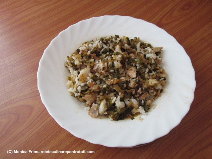Fierbem orezul în dublu cantitatea de apă până e gata și nu mai are zeamă. Îl ținem în frigider până a doua zi. Curățăm și tăiem ceapa, usturoiul mărunt, tocăm frunzele. Tăiem pieptul cuburi, sărăm, piperăm, prăjim în uleiul încins până își schimbă culoarea. Adăugăm ceapa, usturoiul și amestecăm 2-3 min., până se înmoaie. Punem orezul, 2 linguri de apă, ierburile Italia, amestecăm 1 min., adăugăm frunzele tocate, omogenizăm și stingem focul.
