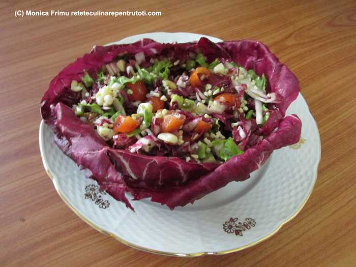 Curățăm radicchio, desfacem frunzele, punem în apă rece cu sare și 2 linguri zeamă de lămâie/oțet 10 min., pt. a ieși gustul amar, scurgem și tăiem mărunt; păstrăm 2-3 frunze mari de la exterior. Curățăm salata creață și tăiem tăiței. Tăiem roșiile ¼, cașcavalul cubulețe. Într-un bol amestecăm ingredientele cu sos. Pe o farfurie rotundă așezăm frunzele de radicchio pătrate, formând un cuib, în care punem salata și servim.