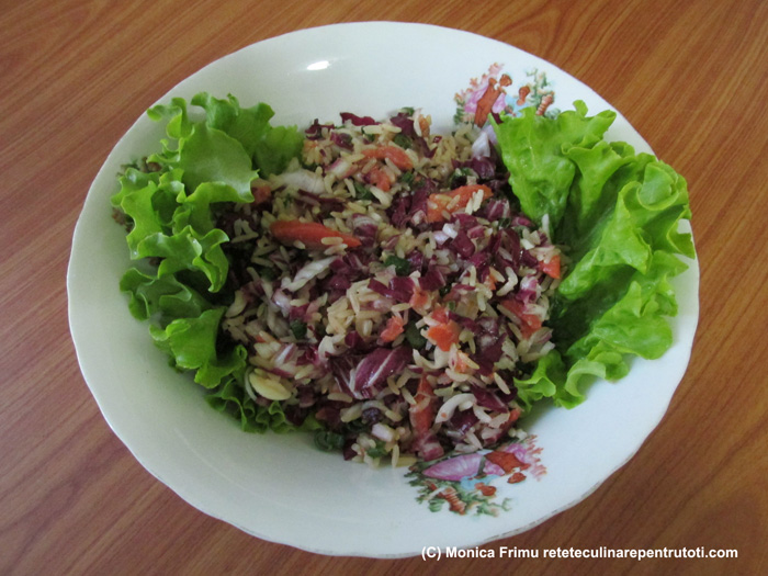 – 1 radicchio, 1 punguță cu orez natur (125 g), 2 cepe verzi, 100 g hering afumat marinat, 3 linguri zeamă de lămâie, frunze de salată verde creață pt. servit