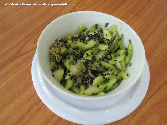 – 500 g castraveți, 2 cepe verzi, 1 ardei iute verde mic, 1 ½ linguri semințe de susan negru, 1 ½ linguri suc de lime, 2 lingurițe sos de soia, 1 linguriță oțet de orez, 1 linguriță zahăr brut, câte ½ lingură ulei de arahide și ulei brun de susan, sare