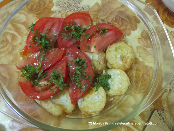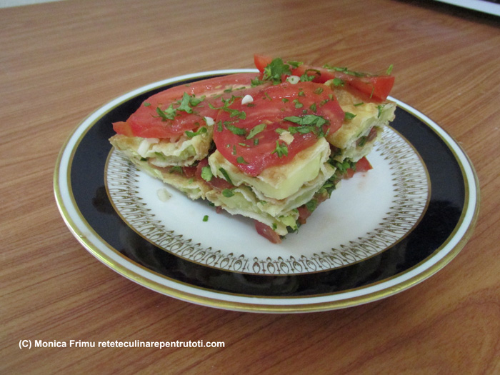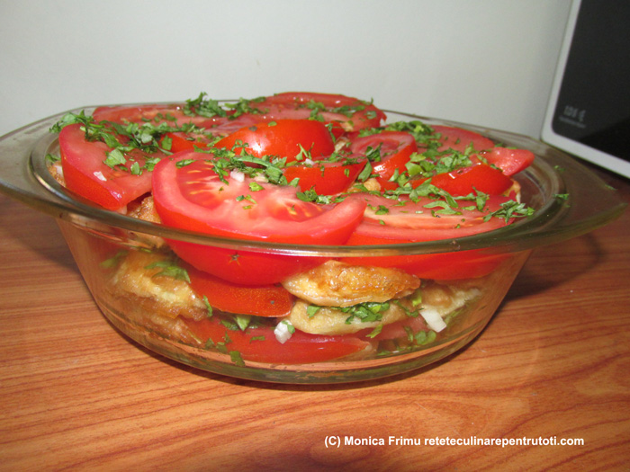 Repetăm operația, ultimul strat fiind felii de roșie. Punem acoperit în frigider până a doua zi.