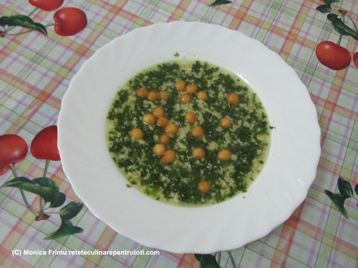 Spălăm hasmațuchi, rupem codițele și tocăm mărunt frunzele. Îl călim 30 sec. În untul topit, punem 2 linguri de apă și lăsăm să fiarbă, sub capac, 5 min. Turnăm supa, dăm 2 clocote. Amestecăm oul bătut cu smântâna, sare, piper negru, turnăm în supă, amestecăm și stingem focul. Servim caldă cu crutoane.