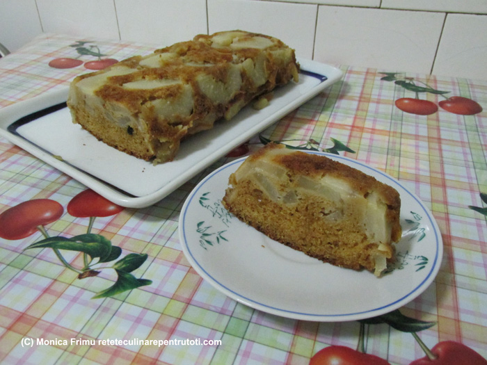 Punem în cuptorul preîncălzit la foc mediu aprox. 30 min. (testul cu scobitoarea). Răcorim, răsturnăm pe o tavă și lăsăm să se răcească. Tăiem felii și servim simplu sau cu frișcă.