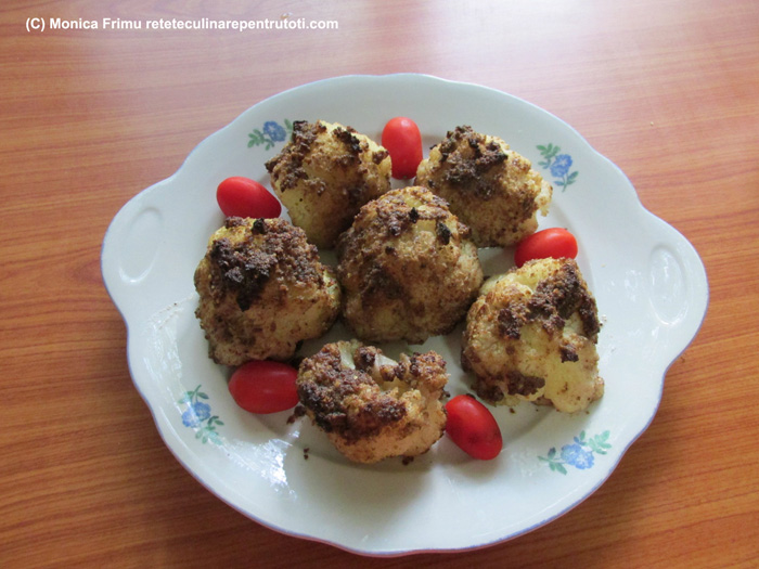 Încălzim cuptorul. Stoarcem lămâia și radem coaja. Curățăm conopida, desfacem floretele, spălăm, le opărim câteva minute în apă clocotită și scurgem. Prăjim câteva minute, într-o tigaie încinsă, condimentele amestecate cu migdalele. Presărăm cu sare conopida, ungem cu ulei, o punem în tigaie, o presărăm cu coaja de lămâie și stropim cu zeama de lămâie turnând-o treptat. Lăsăm pe foc câteva minute. O transferăm într-o tavă tapetată cu hârtie de copt și turnăm pe fiecare bucată amestecul din tigaie. Punem în cuptorul preîncălzit la foc mai mare (200) aprox. 15 min., până se rumenește puțin. Servim caldă.
