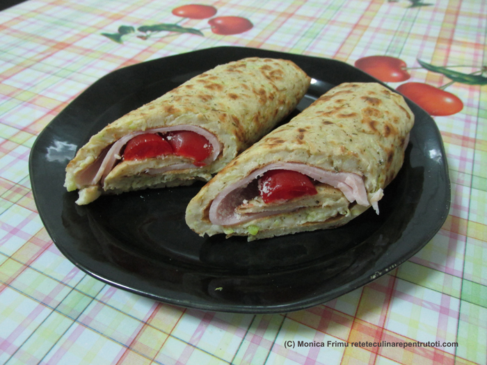 Călduțe le umplem după preferință; eu am așezat o felie de șuncă de pui, jumătăți de roșii Cherry și am presărat brânză rasă.