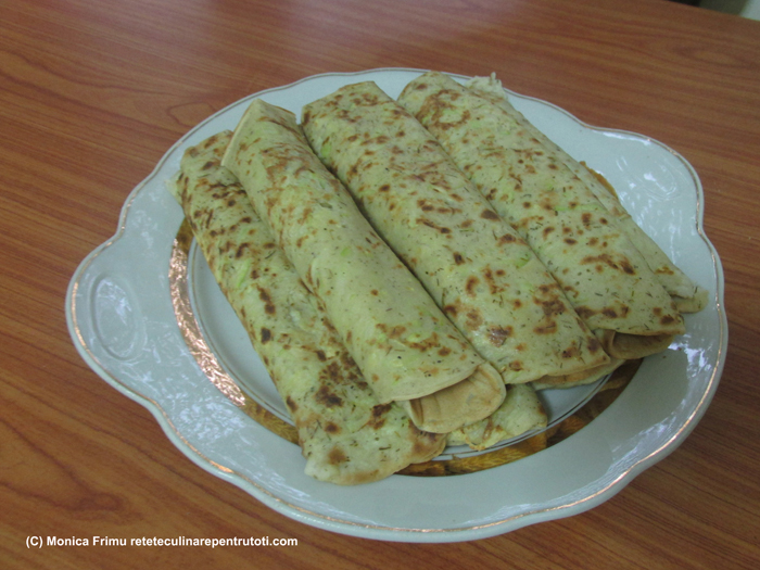 Curățăm dovleceii, radem mare, îi punem într-o sită, presărăm cu sare și lăsăm să stea 10 min. și scurgem bine prin presare. Mixăm ouăle cu piper, mărar, rozmarin, sare, adăugăm făina și apa minerală alternativ, la sfârșit punem uleiul, obținând un aluat pt. clătite în care încorporăm dovleceii și omogenizăm. Punem în frigider 20 min. Într-o tigaie pt. clătite încinsă turnăm cu un polonic din compoziție astfel ca să acopere uniform fundul. Prăjim clătitele pe fiecare parte, la foc mediu, aprox. 1-2 min., până se rumenesc ușor. Le scoatem pe o farfurie, rulăm și ținem la cald acoperite până terminăm toată compoziția.