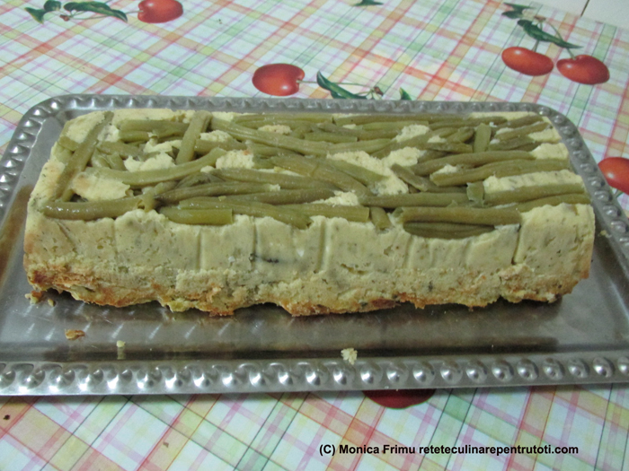 Fierbem separat cartofii, 2 ouă, fasolea și morcovul. Curățăm cartofii, mărunțim ca pt. piure. Tăiem jumătate din fasole mărunt. Le mestecăm cu untul, 1 ou fiert, 2 ouă crude, telemeaua rasă, sare, piper după gust, frunzele de țelină și mixăm la viteză mică. Curățăm usturoiul, pisăm și amestecăm cu fasolea lăsată de o parte. Ungem cu unt o formă de chec, o tapetăm pe fund cu hârtie de copt și punem fasolea cu usturoi. Întindem jumătate din compoziția cu cartofi. Așezăm pe mijloc, în lungime morcovul. Acoperim cu restul compoziției cu cartofi și presărăm brânza rasă. Punem în cuptorul preîncălzit la foc mediu (180) aprox. 50 min., până se rumenește ușor. Lăsăm să se răcorească și scoatem prin răsturnare.