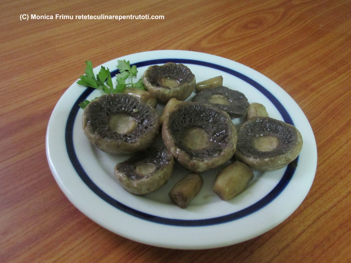 Curățăm ciupercile, tamponăm cu hârtie absorbantă pt. a se usca. În uleiul încins punem ciupercile rărite, la foc iute, amestecând din când în când, până prind culoarea caramel. Le sotăm în mai multe tranșe pt. a nu fi înghesuite, altfel vor lăsa apă și se vor fierbe. Sărăm, piperăm, turnăm vinul și lăsăm pe foc până de evaporă. Servim calde. Putem presăra cu usturoi, pătrunjel verde, etc.