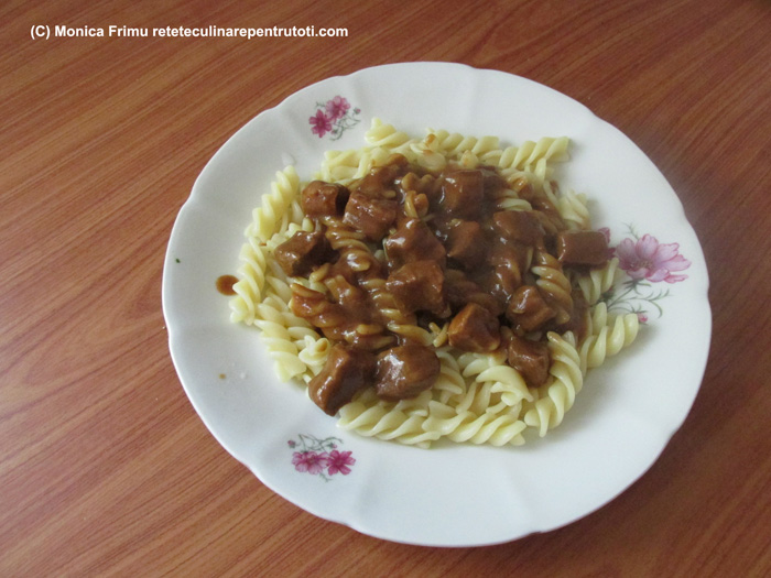 Scurgem bine pastele, porționăm în farfurii. Peste punem carne cu sos și servim imediat.
