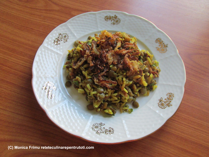 Ștergem wokul bine, prăjim uscat semințele de cumin și coriandru, aprox. 30 sec., adăugăm orezul, uleiul de măsline și îl prăjim 1 min., până devine transparent. Adăugăm pe rând, amestecând, turmericul, scorțișoara, garam masala, zahărul, apoi sare și piper. Adăugăm apa și fierbem la foc mic aprox. 15 min., amestecând rar. Punem lintea, zeama de lămâie, coriandrul tocat mărunt, ½ ceapă, omogenizăm și stingem focul. Servim caldă/rece presărată cu ceapă crocantă.