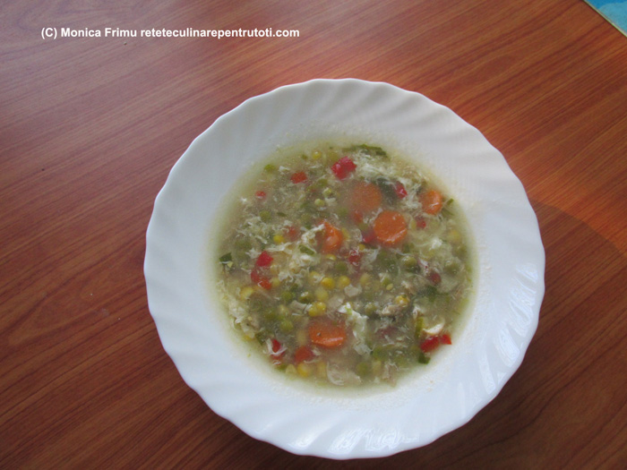 Curățăm pulpele de piele și tăiem ½. Curățăm ceapa, morcovul, ceapa verde pe care o tăiem mărunt, tăiem ardeiul cubulețe. Spălăm cu apă rece și scurgem porumbul și mazărea.Fierbem în apă carnea, ceapa și morcovul întregi, spumăm. Când e gata strecurăm, aruncăm ceapa, scoatem carnea de pe oase și o tăiem mărunt, tăiem morcovul rondele. Punem carnea în supă, când dă în clocot adăugăm porumbul, mazărea, sare, piper și fierbem, la foc mic, 15 min. Călim ardeiul în ulei 2 min., apoi stingem cu oțet. Îadăugăm ardeiul, morcovul și ceapa verde crudă în supă. Într-un bol amestecăm făina cu mălaiul, zahărul și dizolvăm în câte puțină apă până obținem consistența unei smântâni. Turnăm în supa clocotindă, amestecăm încet, fierbem la foc mic 2-3 min. și stingem focul. Amestecăm ouăle (NU le batem pt. a nu face spumă) și le amestecăm în supă. Servim supa fierbinte.