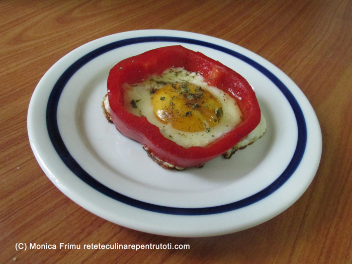 Tăiem 1 rondea de ardei roșu de 1 cm grosime. Încingem o tigaie teflonată picurată cu ulei, punem rondeaua de ardei și prăjim 30 sec. La mijloc spargem un ou, condimentăm cu sare, piper, eu am pus și puțin busuioc uscat. Prăjim, la foc mediu, până se coagulează. Servim imediat.