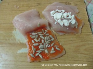 Tăiem pieptul ½ pe lățime. Fiecare bucată o tăiem în 3 felii, lăsând un capăt întreg. Ungem o felie cu pastă Gulyas și presărăm ½ semințe. Acoperim cu doua felie de carne și presărăm brânză.