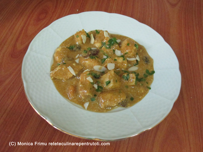 – 4 buc. piept de pui dezosat și fără piele, 1 ceapă tocată, 2 cm ghimbir tocat, 2 căței de usturoi tocați, 150 g iaurt grecesc, ¼ linguriță zahăr auriu, 4 linguri pastă korma, 400 ml supă de pui, câte 4 linguri stafide și arahide, ½ leg. coriandru tocat pt. servit, +/- 50 g fulgi de migdale