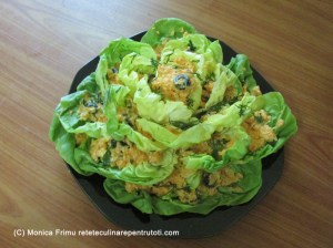 Curățăm morcovii, măcinăm, sărăm după gust, amestecăm cu maioneza și măslinele. Desfacem frunzele salatei având grijă să nu le rupem de mijlocul ei. Pe fiecare frunză punem pastă de morcovi. Rupem mărunt mărarul și presărăm peste salată. Servim imediat.