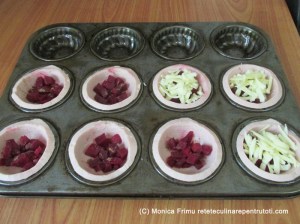 Tăiem parizerul rondele de 0,5 cm grosime. Folosim o tavă de brioșe la care îi ungem formele cu ulei, punem câte o felie în fiecare și presăm ca să ia forma. În fiecare așezăm sfeclă și acoperim cu Gouda rasă mare.