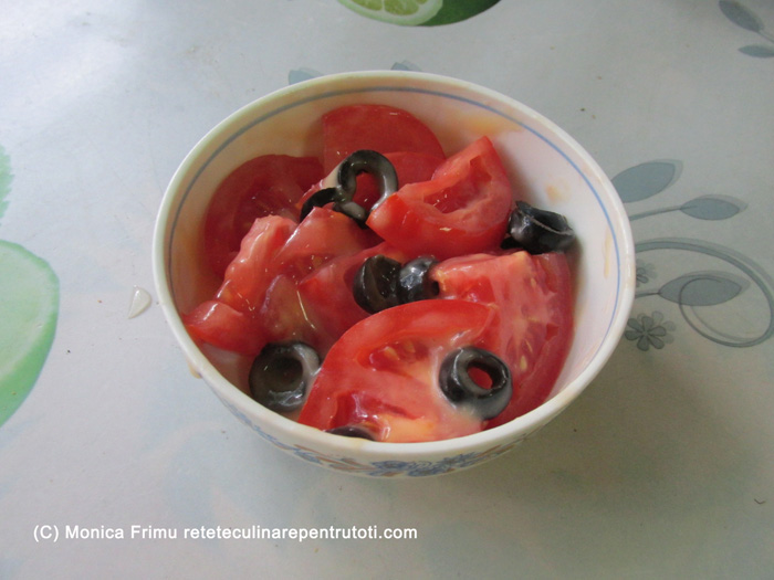 Frecăm gălbenușul cu uleiul până se îngroașă ca o maioneză. Dizolvăm zahărul în zeama de lămâie. Curățăm usturoiul, zdrobim, amestecăm cu zeama de lămâie, apoi cu maioneza și sare după gust. Tăiem roșiile felii, amestecăm cu măslinele, sosul de usturoi și servim imediat.