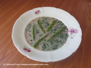 – 100 g sparanghel verde, 10 frunze mari de sfeclă roșie, 1 cățel de usturoi, 2-3 linguri smântână, sare, 1 linguriță piper cu lămâie, 1 l apă