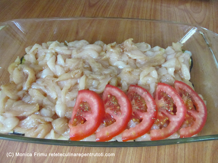 Acoperim cu carnea, deasupra punem felii de roșii și presărăm cimbrul.