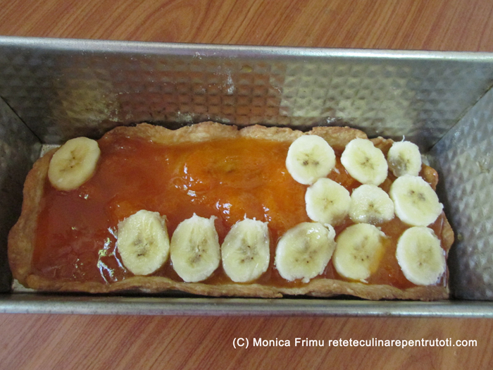 Peste crusta de aluat întindem uniform gemul de caise, astfel încât să nu depășească marginile aluatului. Curățăm bananele de coajă, tăiem rondele și punem peste gem.
