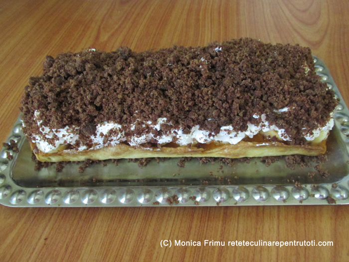 Mixăm frișca tare, întindem peste banane și scoatem pe o tavă. Deasupra presărăm blatul cu cacao fărâmițat. Punem în frigider 3 ore.