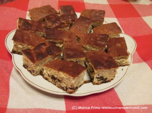 Frecăm gălbenușurile cu zahăr până obținem o cremă. Adăugăm făina, pesmetul, stafidele, nucile, coaja rasă de lămâie și omogenizăm. Mixăm albușurile spumă tare cu un praf de sare și le încorporăm în compoziție amestecând ușor cu o lingură. Întindem compoziția într-o tavă tapetată cu hârtie de copt. Punem în cuptorul preîncălzit la foc mediu (180) aprox. 25-30 min. (testul cu scobitoarea) Răcim, porționăm, scoatem pe un platou și servim.