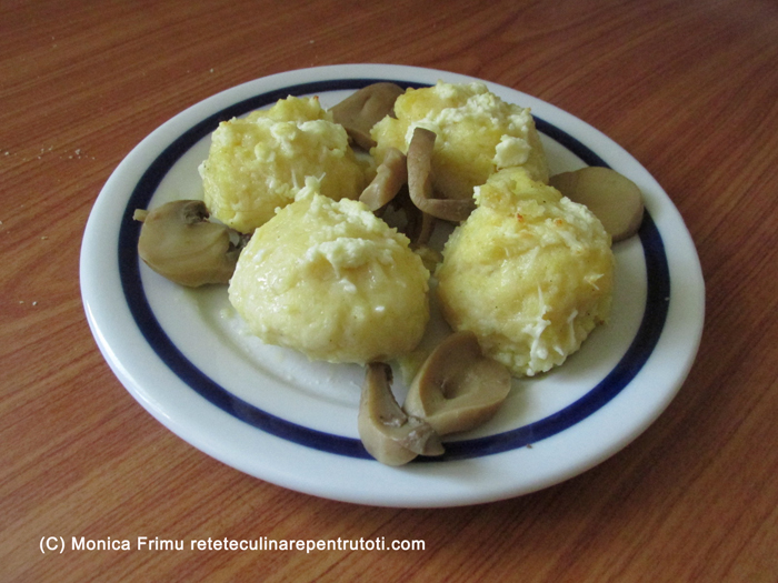 Spălăm cartofii, fierbem cu coajă, curățăm și pasăm. Amestecăm cu o bucățică de unt cât o nucă, ouăle, făina, 1 lingură de brânză rasă mic, sare și pier după gsut. Într-o cratiță clocotim apă cu puțină sare. Din compoziția de cartofi modelăm găluște cu mâna dată prin făină. Le punem în apă, stingem focul și lăsăm să stea 15 min. Scurgem, așezăm într-o formă pt. cuptor, presărăm brânză rasă și stropim cu 1 lingură de unt topit. Punem în cuptorul preîncălzit la foc mediu (180) aprox. 15 min., până se topește brânza. Servim imediat.